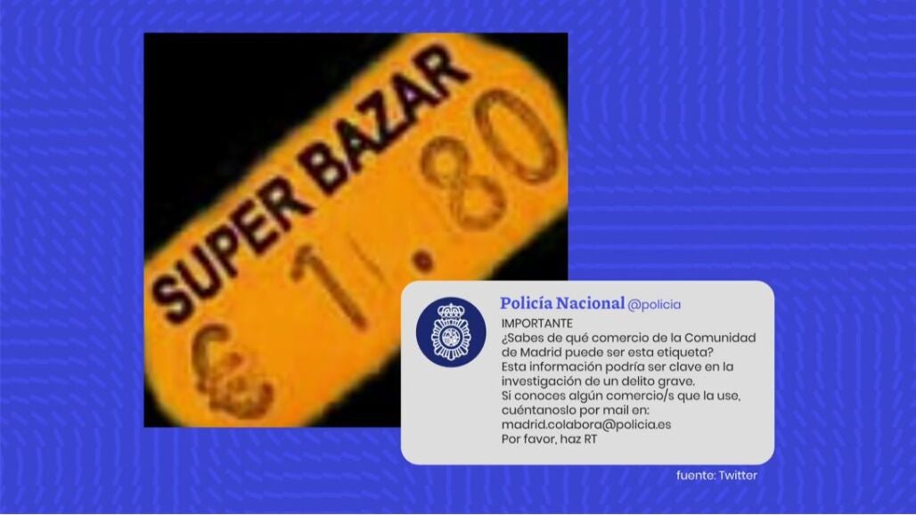 'Super Bazar'. Localizar un comercio concreto en la Comunidad de Madrid con ese nombre parece una labor imposible incluso para los agentes de la Jefatura Superior de Policía de Madrid. Sobre todo si la única pista es una etiqueta demasiado común, demasiado habitual, en el que tan sólo figura el precio, 1.80 euros, y un nombre de comercio muy genérico. Por eso, la Policía ha pedido colaboración ciudadana para localizar ese establecimiento, un dato que “podría ser clave en la investigación de un delito grave”, según detallan en la red social Twitter en la que han hecho esta petición de ayuda.