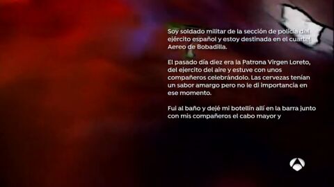 Según la soldado, durante la celebración del Día de la Patrona del Ejército del Aire fue drogada y violada por sus compañeros en el cuartel de Bobadilla, después de haber tomado una cerveza en un pub en la que, afirma, "notó un sabor extraño". La soldado cuenta que se despertó en el cuartel al día siguiente de esa celebración con las medias bajadas, fuerte dolor de cabeza, un hematoma y molestias en el pecho.