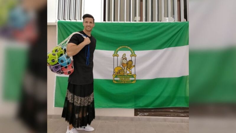 Pablo Santaella Barcos es profesor de educación física en un instituto de Andalucía y ha querido dar una lección a sus alumnos. Este profesor se ha presentado a la clase con una faldade tipo flamenco hasta los tobillos.
