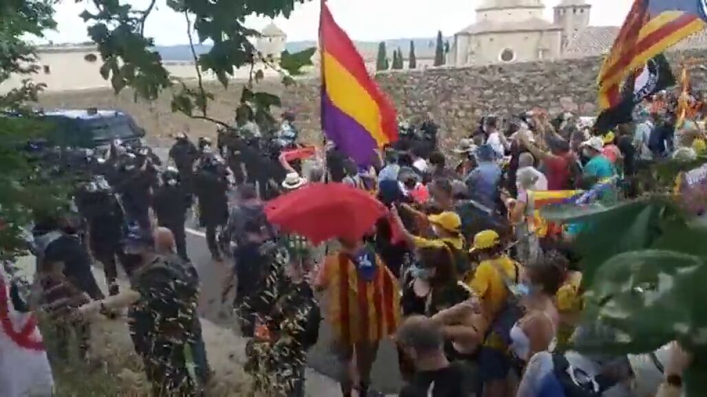 Un cordón de los Mossos d'Esquadra intentan impedir que se lleve a cabo dicha marcha que se encuentra ya a 200 metros del monasterio al que acuden Felipe VI y Letizia.