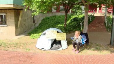 Paqui ha plantado una tienda de campaña delante de su piso en el que vive una pareja que no paga el alquiler y se niega a irse. No dejará de protestar hasta que recupere su vivienda.