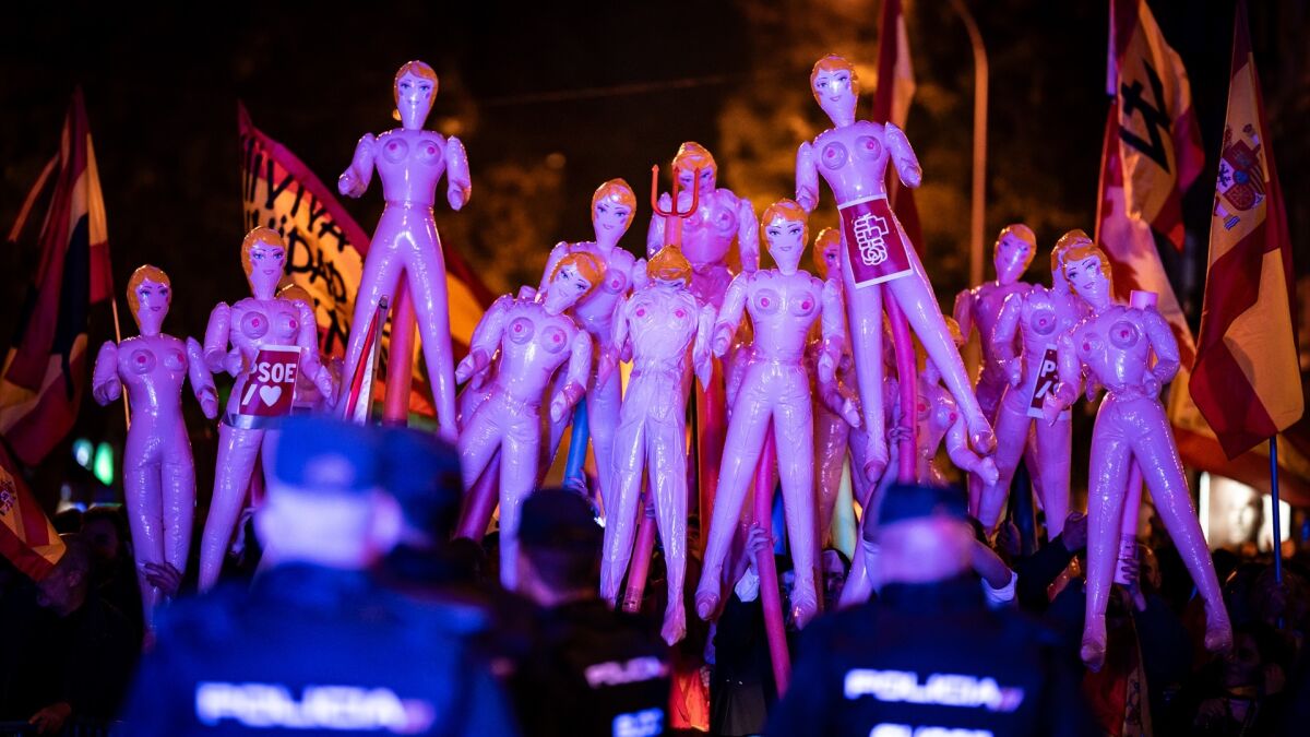 Las protestas, centradas en rechazar la ley de amnistía, continúan dejando diferentes imágenes cada día. En esta ocasión, un grupo de manifestantes irrumpió con, al menos, 20 muñecas hinchables al grito de consignas provocativas. Esta acción se sumó a cánticos que hacían referencia a la condonación de parte de la deuda catalana, y al grito de: "No es una sede, es un puticlub". Algo que ha generado un ambiente tenso en la zona.