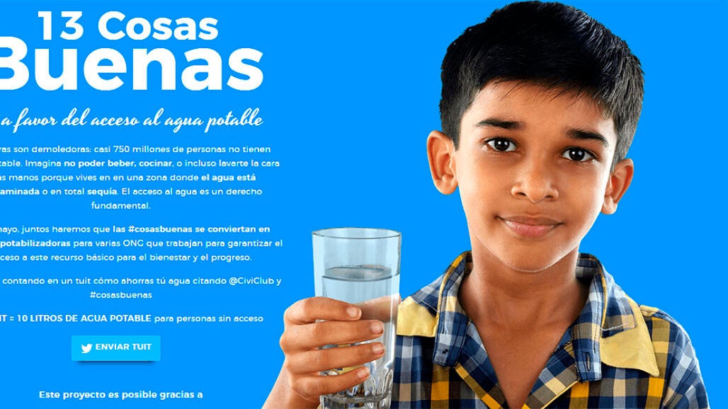 Las cifras son demoledoras: casi 750 millones de personas no tienen agua potable. Del 29 al 31 de mayo, cada tuit citando a @CiviClub y el hastag #cosasbuenas se cambiará por diez litros de agua potable a través de pastillas potabilizadoras para varias ONG que trabajan para garantizar el acceso a este recurso básico para el bienestar y el progreso.