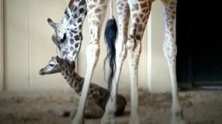 En el caso de las jirafas, cuya gestación dura de 450 a 468 días, las madres dan a luz de pie e incluso caminan durante el alumbramiento. Durante las dos primeras semanas, los pequeños pasan casi todo el tiempo sentados, protegidos por sus madres, ya que en ese momento pueden ser atacadas por la mayoría de los depredadores.