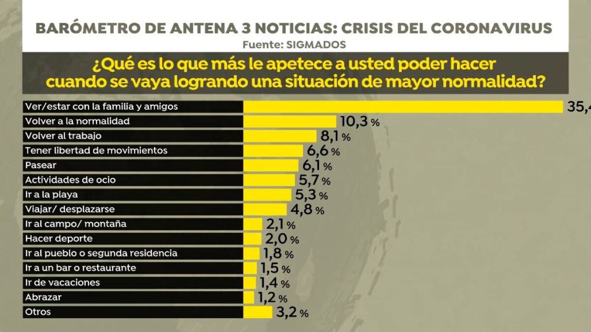 El barómetro de Antena 3 Noticias elaborado por Sigma Dos recoge las opiniones de los españoles en torno a la crisis del coronavirus en la que se encuentra sumido el país. La encuesta pregunta a los españoles cuál es su mayor deseo una vez se recobre la normalidad tras la pandemia del covid-19.