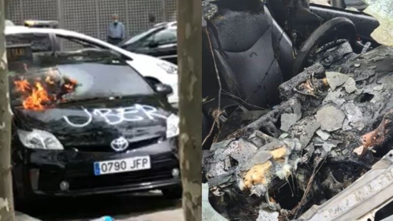 En el vídeo se ve como un coche está ardiendo en plena calle Jerez de la Frontera en Badalona y, aunque luzca la pegatina de 'Free Now', el responsable del incendio decidió vincularlo con 'Uber' grafiteando sobre el capó del vehículo. Por el momento, los Mossos d'Esquadra investigan lo ocurrido y aún no han encontrado a ningún responsable.