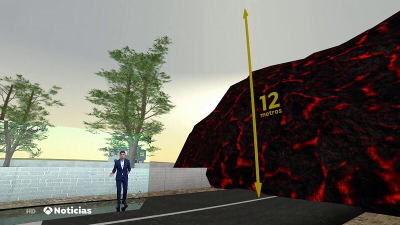 En Antena 3 Noticias hemos representado con realidad aumentada las dimensiones que alcanzan dichas coladas de magma que en algunos puntos se han convertido en un muro de lava de 12 metros. Para hacernos una idea concreta de su gran envergadura la lengua del norte sería equivalente a un edificio de 6 pisos. La del sur es un poco más baja pero aún así casi alcanza los 10 metros.