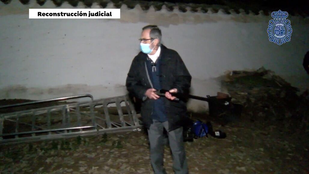 En ese momento, cerca del almacén de herramientas, vio un bulto en forma troncocónica y una motosierra apuntando hacia él a una distancia de entre 10 y 12 metros. Sin sospechar que se trataba de una persona, disparó hasta en tres ocasiones, pero el bulto no se movió. Después de eso, llamó a la Guardia Civil y posteriormente a la Policía Nacional.