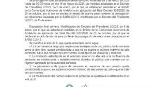 Las restricciones que se mantendrán en toda Andalucía será tanto el cierre perimetral de la comunidad como de sus provincias, además de las medidas mencionadas anteriormente en cada municipio, y el toque de queda desde las 22:00 a las 6:00 horas, con el fin de evitar un repute de contagios por coronavirus de cara a Semana Santa.