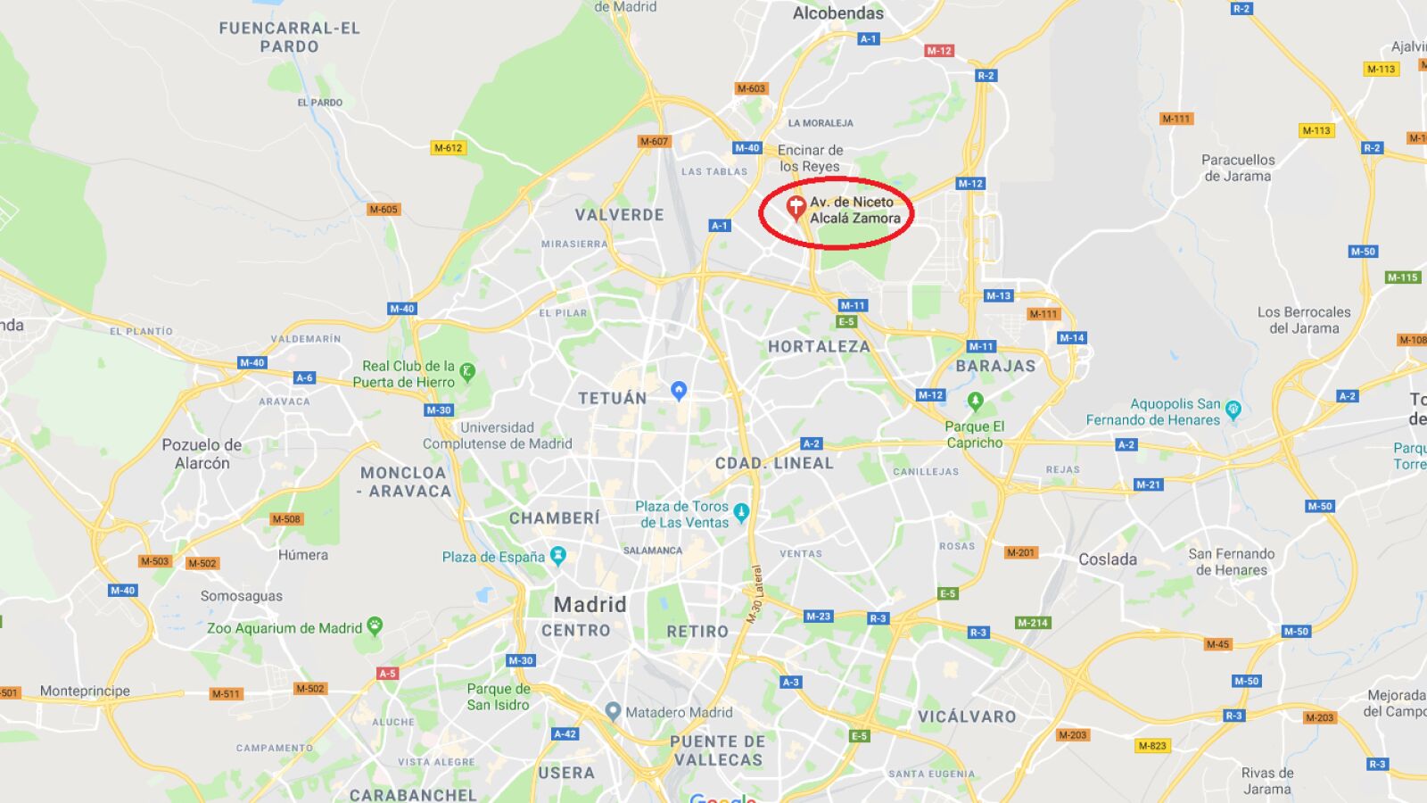 La rotura del colector de agua, que afecta a cerca de un millón de personas en varios distritos del este de Madrid y en zonas de los municipios de Alcobendas, Paracuellos del Jarama y Coslada, ha dejado un socavón de entre 100 y 150 metros cuadrados en la calle Niceto Alcalá, según han informado fuentes de Emergencias Madrid.