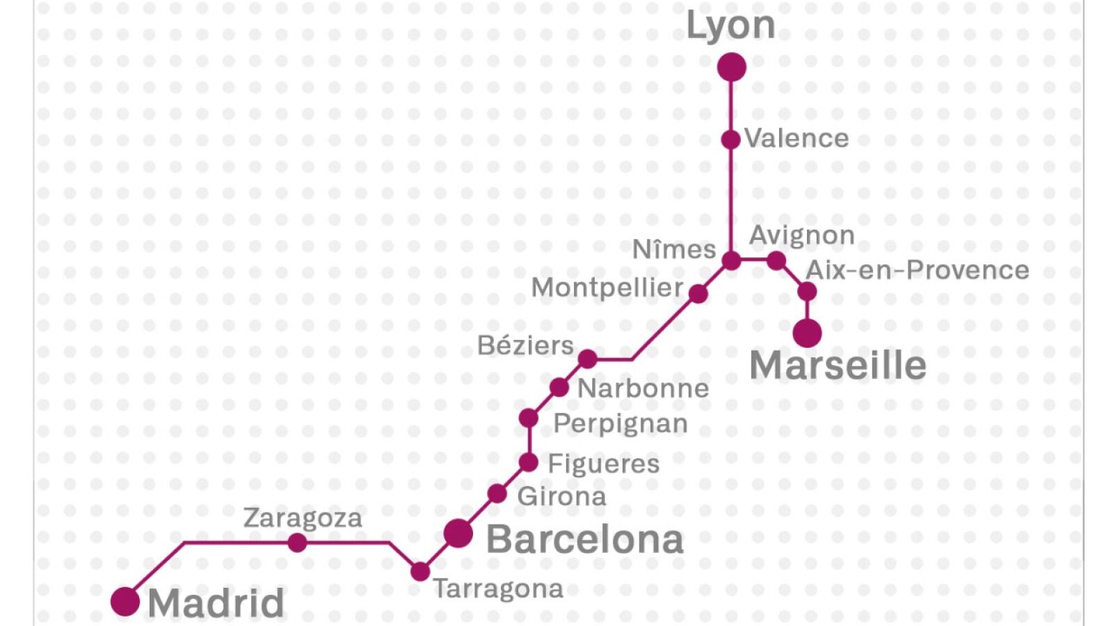 La conexión AVE entre Barcelona y Lyon incluye el estacionamiento en Barcelona Sants, Girona, Figueres Vilafant, Perpiñán, Narbona, Béziers, Montpellier-St-Roch, Nîmes, Valence TGV y Lyon Part Dieu.