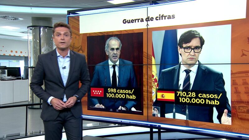 Datos diferentes pero obtenidos de la misma fuente. Salvador Illa asegura que las cifras que manejan en el ministerio han sido facilitadas por la Comunidad de Madrid pero el dato no coincide. El Ministerio de Sanidad asegura que en Madrid hay una incidencia de contagios de 710,28 casos por cada 100.000 habitantes, pero la Comunidad rebaja esos contagios y cifra la incidencia en 598 casos por coronavirus.