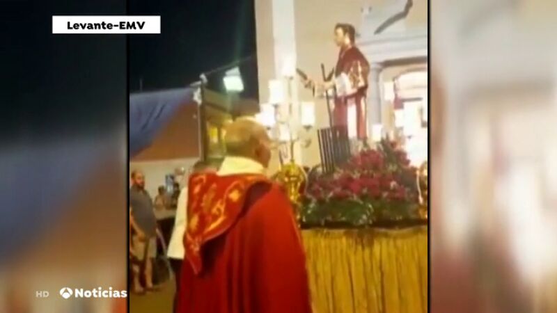 La imagen de San Lorenzo, patrón de Masalfassar, en Valencia, ha terminado por los suelos. Los costaleros tropezaron con el escalón a la entrada de la iglesia. El paso no ha sufrido daños.
