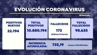 La incidencia acumulada continúa bajando, situándose hoy en 735 casos por cada 100.000 habitantes a 14 días. Según los datos hoy se han notificado 22.194 nuevos contagios y 173 muertes de coronavirus.