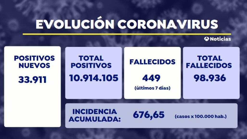 Desde que comenzara la pandemia de la Covid-19, la cifra total de infecciones en España se eleva a 10.914.105 y la de fallecidos a 98.936 según las estadísticas oficiales.