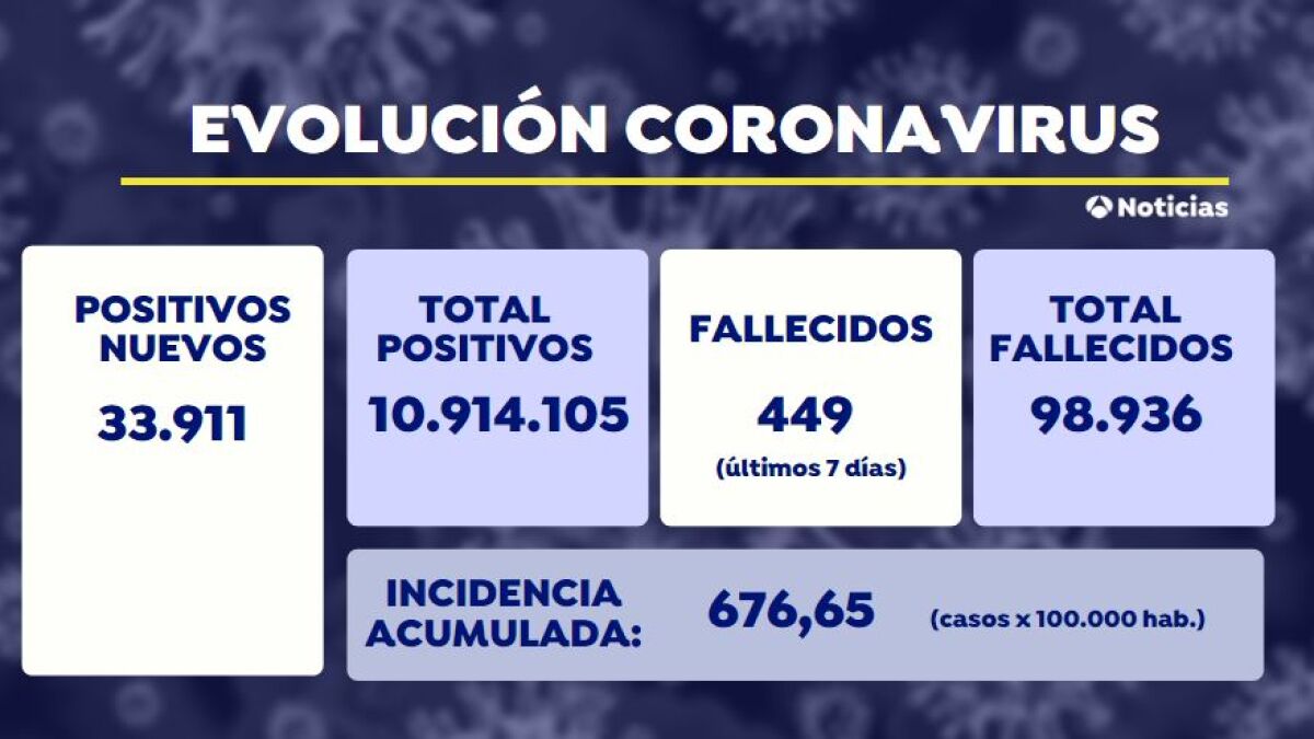 La incidencia acumulada continúa bajando, situándose hoy en 676,65 casos por cada 100.000 habitantes a 14 días. Según los datos del Ministerio de Sanidad se han notificado 33.911 nuevos contagios y 301 muertes de coronavirus.