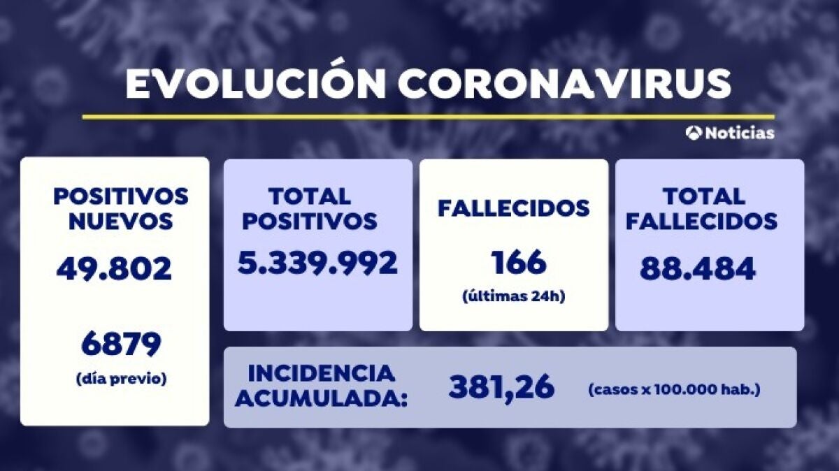 Sanidad confirma 49.802 nuevos casos de coronavirus. Además, la incidencia acumulada vuelve a registrar una subida hasta los 381 casos, más de 58 puntos desde la pasada semana.