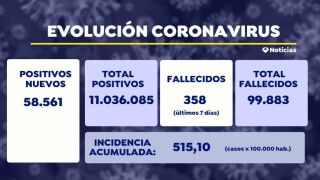 Sanidad notifica 58.561 nuevos contagios por coronavirus mientras la incidencia cae a los 515 positivos