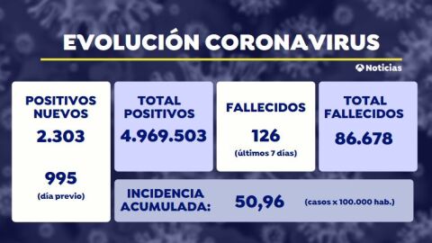 El número total de infectados por coronavirus desde el inicio de la pandemia asciende a 4.969.503 personas y el de fallecidos a 86.678. En cuanto a la incidencia acumulada, sigue a la baja en España con 50,96 casos por cada 100.000 habitantes a 14 días, por lo que se queda al borde de pasar el riesgo bajo (menos de 50).