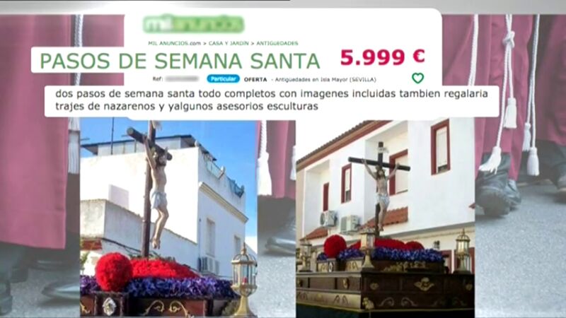 Este caso no es el único. Una asociación de Jerez de la Frontera vende por 27.000 euros un Paso de Misterio. Es de cedro y con candelabros tallados, no incluye la imágenes pero al comprador le regalan los faldones de terciopelo y si tienen dudas de cómo es el paso se puede ver en pleno desfile en un vídeo.