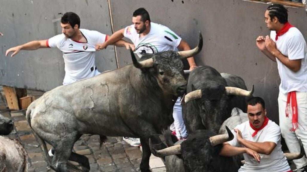 La manada ha enfilado la calle Estafeta ya ligeramente estirada, con dos toros negros adelantados y el resto del grupo más compacto, lo que ha permitido que los corredores comenzaran a vislumbrar huecos que aprovechar para "coger" astas. Poco a poco el primero de los astados ha tomado claramente el mando al dejar un considerable espacio con sus hermanos, en una abarrotada calle de la Estafeta que ha vivido numerosas caídas de mozos, apurados ante las astas y ante el apremio de otros corredores.