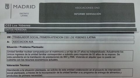 La segunda está compuesta por un matrimonio y un hijo no independizado de 27 años. "Actualmente los únicos ingresos de la unidad familiar corresponden al subsidio para mayores de 52 del esposo", reza el informe redactado -como el primero- por el Centro de Servicios Sociales Yébenes del Ayuntamiento de Madrid.