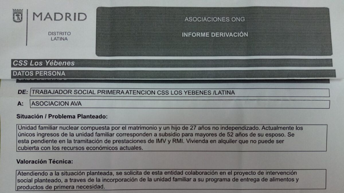 Que lleguen familias buscando ayuda a este tipo de agrupaciones vecinales no es extraño, señala Yolanda Juarros, voluntaria desde hace años en la Asociación Vecinal de Aluche, "lo extraño es que sea Servicios Sociales quien las envíen y que lo hagan por carta".