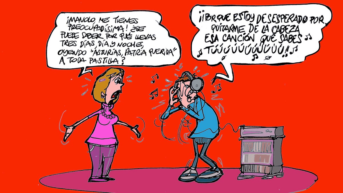 En la ilustración de Alfredo Boto se ve a una pareja de mediana edad y ella pregunta al hombre: "¡Manolo, me tienes preocupadísima! ¿Se puede saber por qué llevas tres días, día y noche oyendo 'Asturias, patria querida', a toda pastilla?".