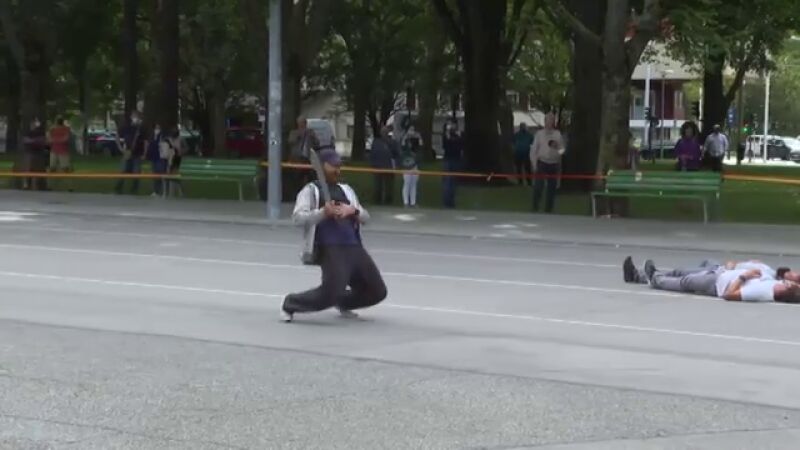 Sobre las 11.30 de la mañana una voz por megafonía anunciaba el inicio del atentado, "queda inaugurado el simulacro", en plena esplanada aparecía el "supuesto terrorista" que amenazaba con un enorme cuchillo a todos los ciudadanos que pasaban por la vía, además el yihadista portaba un chaleco y una mochila donde llevaría la bomba para inmolarse.