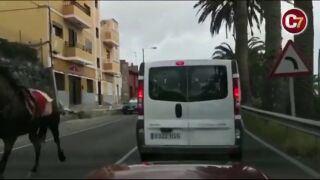 Los conductores que circulaban por la carretera de Jinamar, en Telde, se llevaron un buen susto al ver cómo una yegua sin control avanzaba entre los coches. Al parecer, el equino se asustó al ver un plástico y tiró a su jinete mientras paseaban.