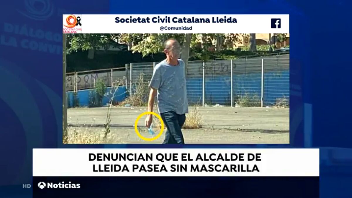 Sociedad Civil Catalana en Lleida denuncia la falta de responsabilidad del alcalde de Lleida, MiquelPueyo, en una foto por pasear por la vía pública sinllevar mascarilla. La mascarilla es obligatoria en toda Cataluña por decreto de la Generalitat.