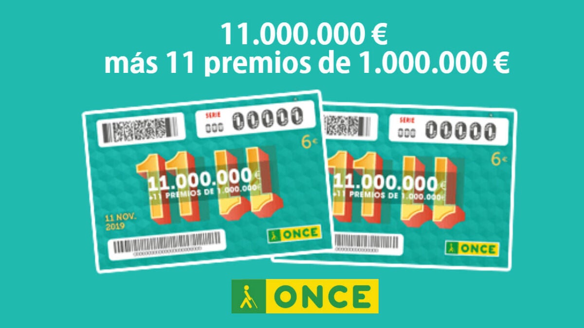 El sorteo 11 del 11 de la ONCE 2019 forma parte de los sorteos extraordinarios que la Organización Nacional de Ciegos de España organiza a lo largo del año. Por la compra de un cupón de 6 euros optarás a un primer premio de 11 millones de euros, 11 premios de 1.000.000 de euros, 11 premios de 111.000 euros y miles de premios más. Los cupones del sorteo del 11 del 11 de la ONCE de hoy están compuestos por un número de cinco cifras que va desde 00.000 hasta 99.999 y un número de serie comprendido entre 1 y 120.