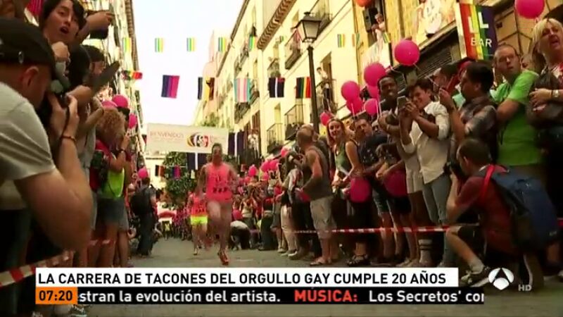 Este jueves se ha celebrado la tradicional carrera de tacones, una de las citas más importantes de las fiestas del Orgullo Gay. Esta tradición lleva 20 años poniendo a prueba a los que se atreven a correr por los adoquines de la calle Pelayo, en Chueca, sobre unos tacones de 15 centímetros.