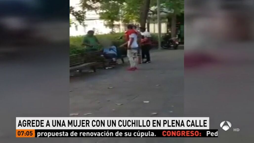 Un hombre amenaza y agrede con un cuchillo a una mujer en plena calle, a la que agarra por la camiseta. Varios testigos intentan socorrer a la víctima, pero también son amenazados.