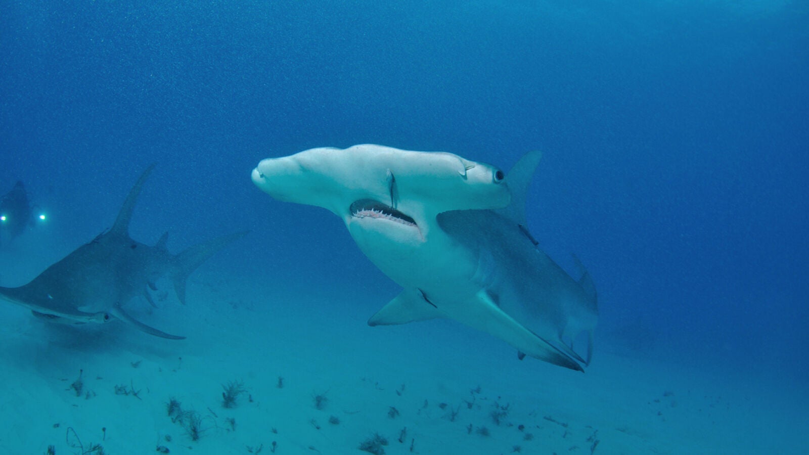 El tiburón martillo es un animal que puede llegar a medir más de 6 metros de longitud y pesar hasta 600 kg, tiene la cabeza en su forma característica de T y unos dientes poderosos. Su dieta es carnívora, pero no supone un peligro para el ser humano ya que los ataques registrados son extremadamente raros. Se alimentan de peces más pequeños, calamares y crustáceos, y no buscan activamente presas humanas.