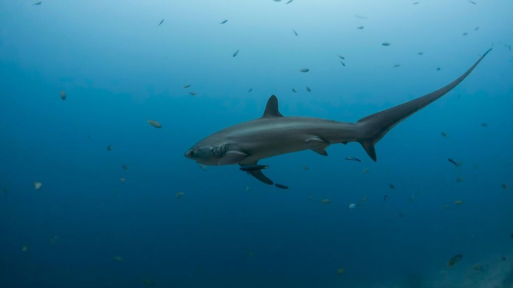 El tiburón zorro normalmente habitan en aguas oceánicas templadas y tropicales. A pesar de su gran longitud, los biólogos marinos aseguran que son inofensivos.