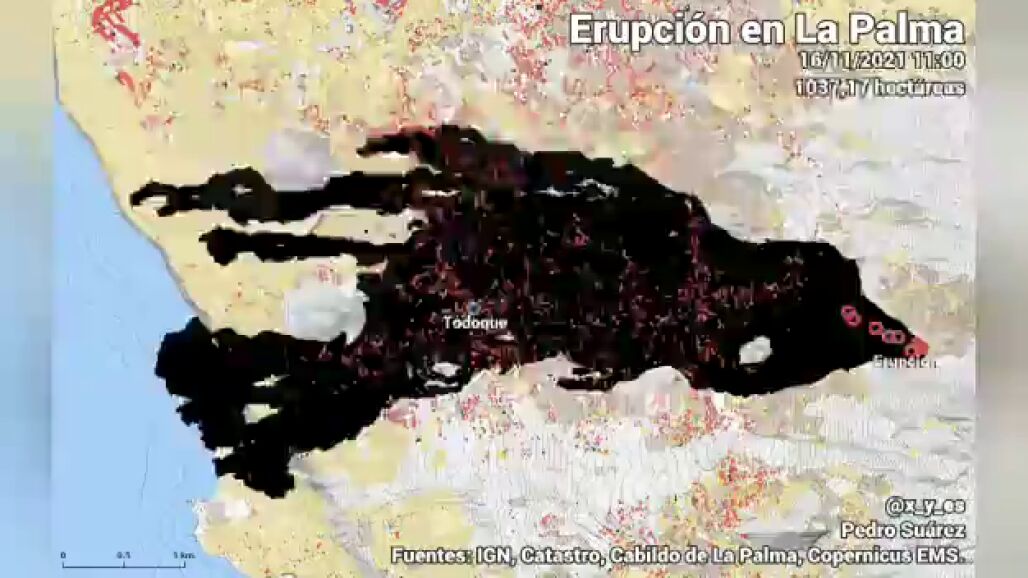 El usuario de Twitter Pedro Suárez (@x_y_es) muestra en un timelapse que puede ver en el vídeo principal de la noticia la evolución del volcán de La Palma y cómo ha ido afectando a los territorios de alrededor desde finales de septiembre hasta la actualidad.