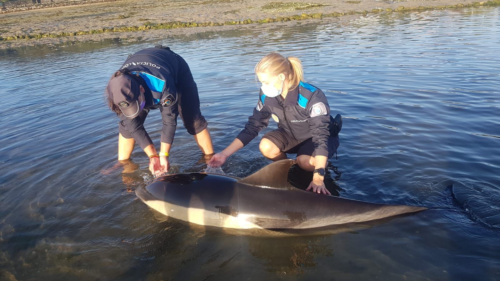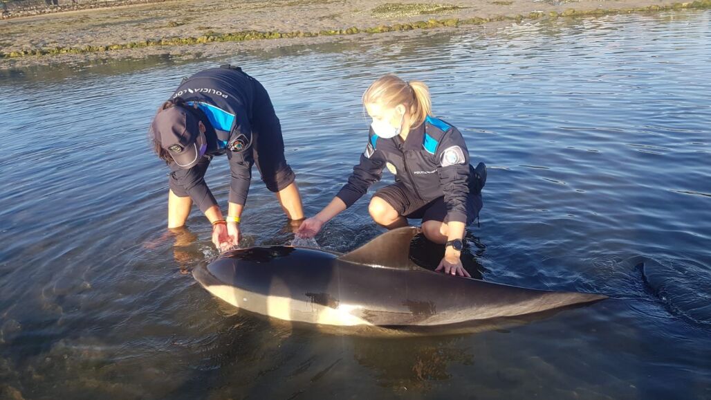 Los delfines quedaron varados y necesitaban ayuda. Tres policías locales de O Grove les tranquilizaron mientras se completaba el rescate.