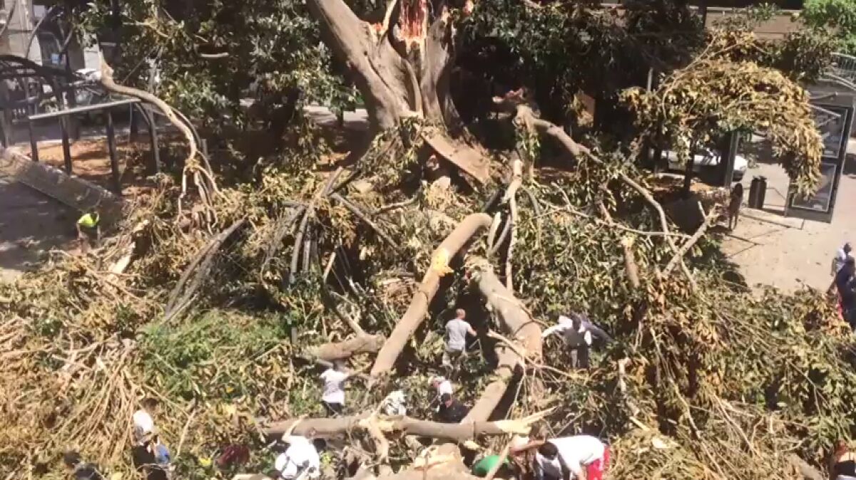 El centenario ficus de 12 toneladas de la plaza de Santo Domingo de Murcia se ha desplomado pasado el mediodía. Hay un herido leve, una adolescente de 16 años, y dos personas han sido atendidas por problemas de ansiedad. El fuerte crujido de la gran rama sirvió de aviso para quienes estaban cerca del árbol.