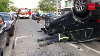 Un conductor de 80 años ha perdido el control de su vehículo y ha atropellado a una mujer que estaba cruzando la calle. Tras una colisión posterior contra otro aparcado, el coche ha acabado volcando en una calle de Pozuelo de Alarcón (Madrid), resultado tanto la mujer como el conductor heridos.