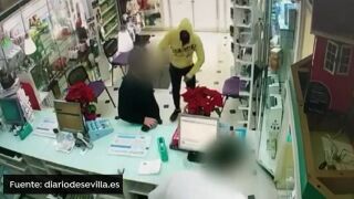 Un atracador amenaza con un cuchillo a un farmacéutico para que le entregue el dinero de la caja fuerte, en Gelves, Sevilla. El farmacéutico se defiende con un bastón para que echarle del local.