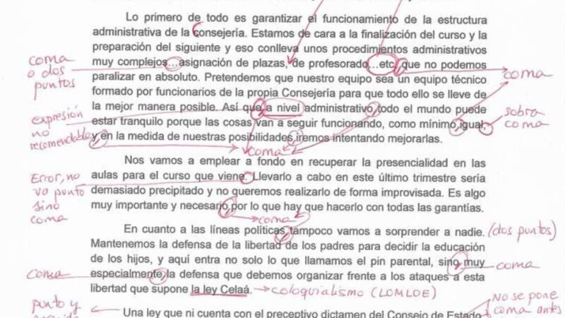 El documento, tres páginas donde la nueva consejera de Educación y Cultura comparte su visión de la educación y cuales serán las "líneas maestras" de su trabajo, esta cubierto de marcas y anotaciones en rojo.