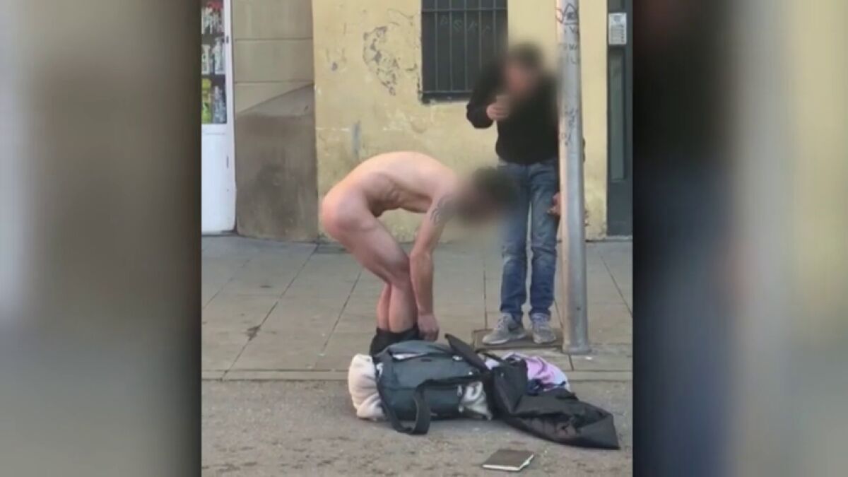 Un hombre desnudo se droga en pleno barrio del Raval, en Barcelona