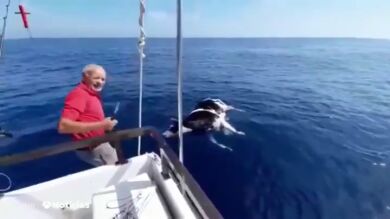 La vaca se ha enganchado al anzuelo del hombre que se encontraba flotando en alta mar.