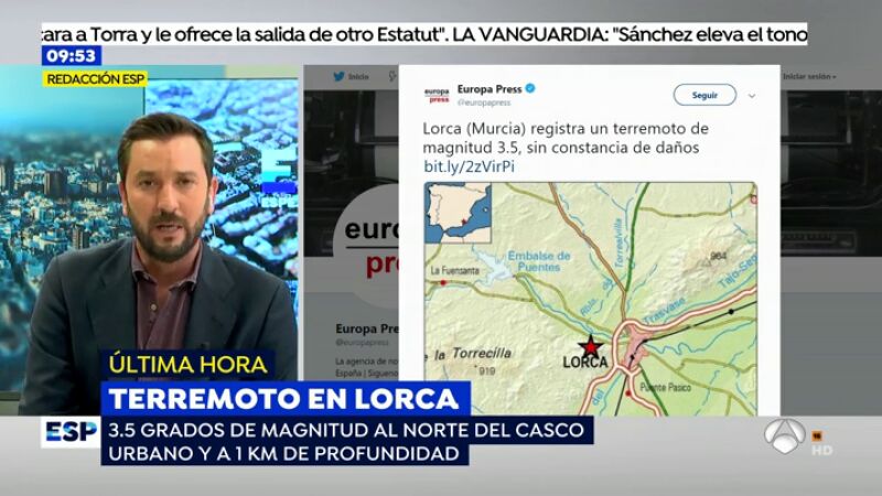 Juan Miguel Bayonas, el concejal de Emergencias del Ayuntamiento de Lorca, ha declarado que se han recibido una veintena de llamadas alertando de la emergencia, pero no se ha reportado ningún tipo de daño ni material ni personal.