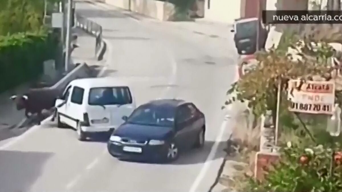 En el vídeo se ve al astado llegando al pueblo. Y ante los gritos de "cuidado" de los vecinos dos coches intentan sin éxito coartarle el paso. El animal tras hacer dos quiebros llegó a una gasolinera.
