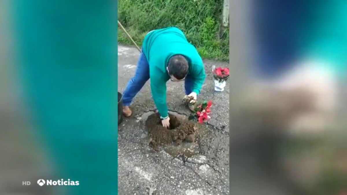 Un vecino de O Porriño, Pontevedra, cansado de que el Ayuntamiento no escuche sus consultas, ha decidido rellenar todos los baches de la carretera con plantas y flores.