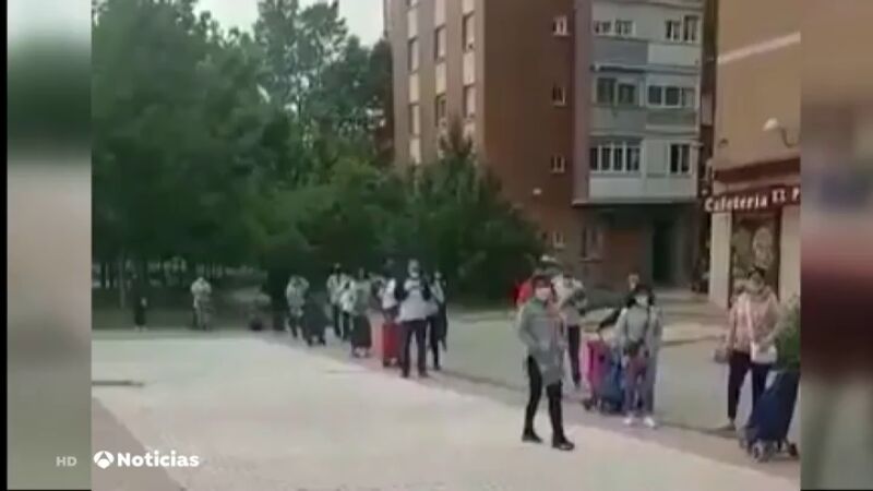 En la calle Quero del barrio madrileño de Aluche se forman largas colas para recoger comida que una asociación de vecinos está repartiendo en un local del barrio para familias vulnerables afectadas por la crisis del coronavirus.