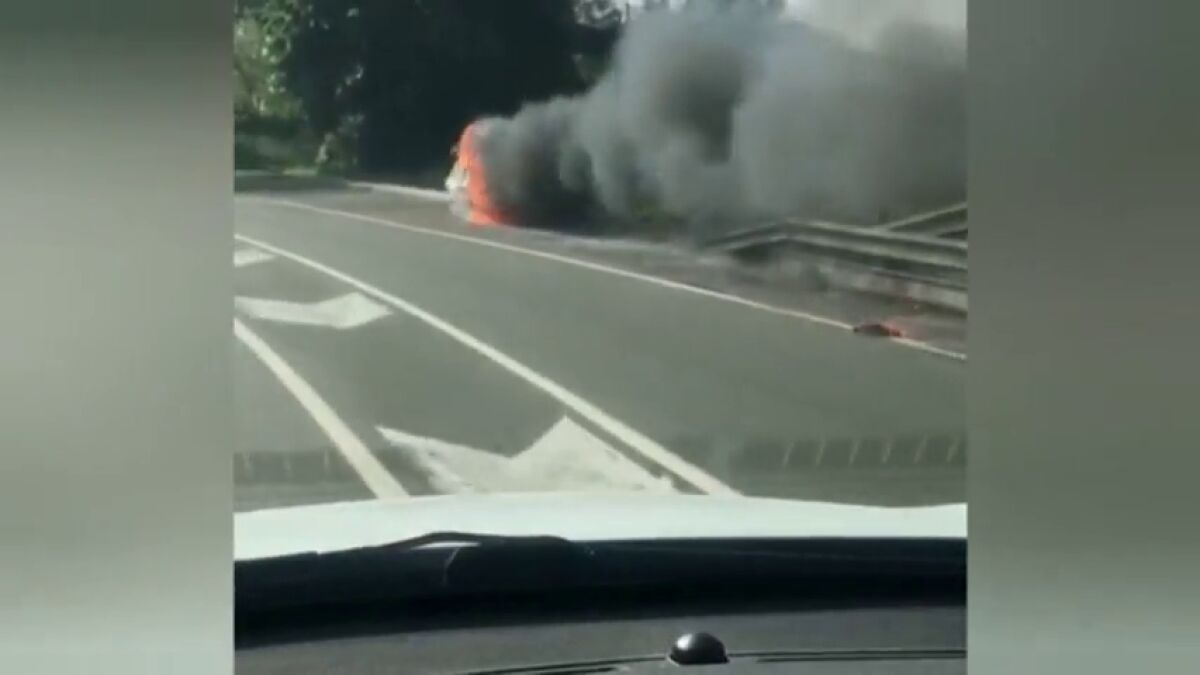 Ha ocurrido esta mañana en la Cuesta de Santo Domingo, en Bilbao. Una furgoneta, al parecer cargada con materiales inflamables, avanza sin control y envuelta en llamas. En el vídeo, grabado por un conductor, puede verse al conductor de la furgoneta, un hombre vestido con traje de pintor, que anda por el arcén.