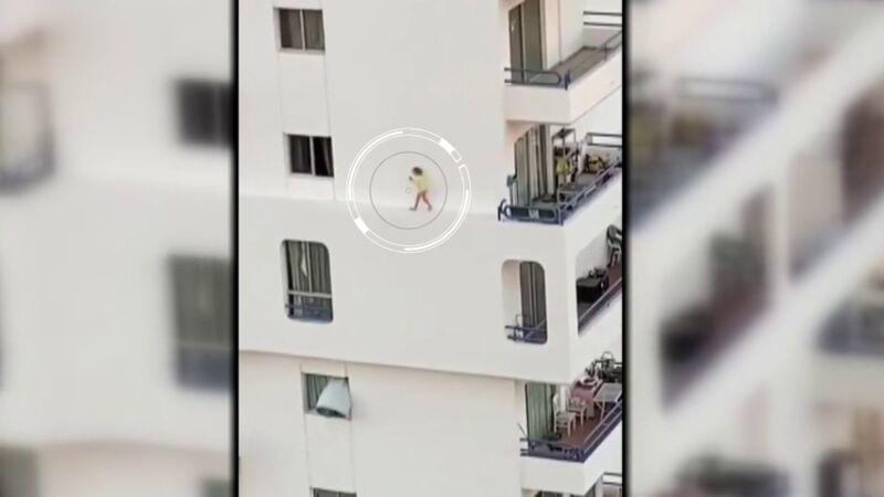 Una niña pequeña corretea por la cornisa de un edificio de apartamentos de Playa Paraíso, en Adeje, en Tenerife.Va y vuelve, a paso ligero e incluso salta. Las imágenes fueron grabadas por un turista.